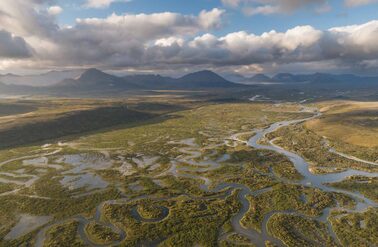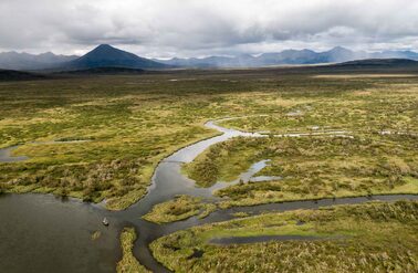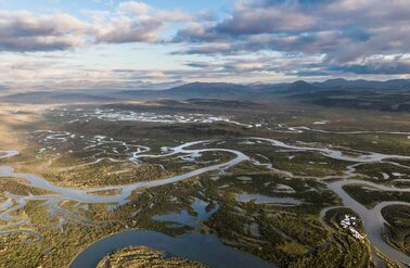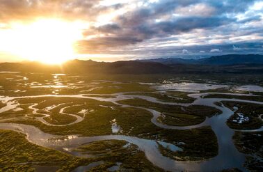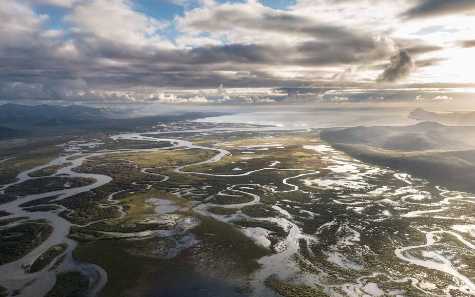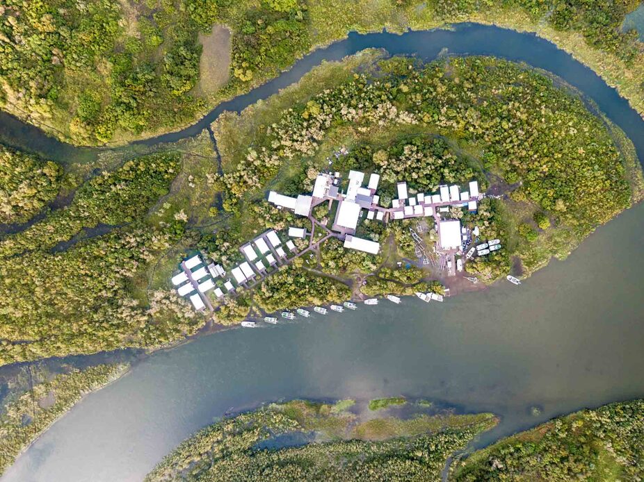 Drone view from the lodge to the estuary and Goodnews village . The extent of the high water in the Goodnews floodplain very evident.