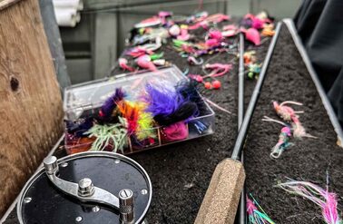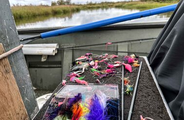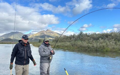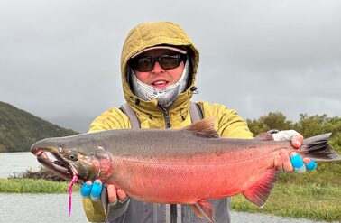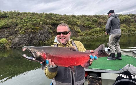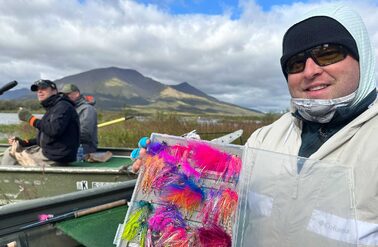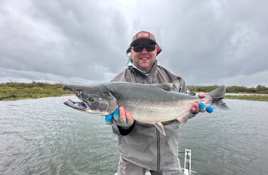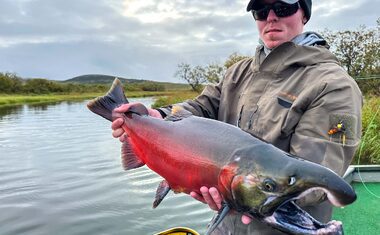 Brighter fish will typically be more energetic, but even ruby red dark Silver salmon will as often as not put up a fantastic fight. Over the week, we caught every shade imaginable, from bright silver sea-liced fish to those that were ready to spawn. You of course can play a Silver on the reel, but given the frequency of bites, it can be more efficient to play a fish by just stripping the line back with your hands. They will jump, they will surge and they will snap rods! Our group broke at least 3 rods playing fish! Single-handed rods are ideal and a 9-10ft rod will work perfectly. Whilst a lighter rod will give a more pronounced fight, as the flies used mainly have large dumbbell or lead eyes, using an 8 or 9wt will make casting much easier and more enjoyable, whilst giving you enough backbone to muscle into a fish when required. Given the volume of salmon you can expect to catch at Goodnews, being able to play a fish hard is useful; the salmon can be returned more quickly, the pool is not as disturbed as it would otherwise be, and you can get on with the job of catching more salmon. Floating lines are used as standard, but you can also use an intermediate or sink tip, although with a weighted fly and slack water, sinking tips really are not really necessary.