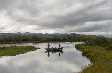 My fishing partner and great friend for our final day, a ‘Viking’ from Iceland, Tomasz, had been religiously counting our daily catches. Given that we had been landing, per pair of anglers in excess of 30 silver salmon each day, keeping a count was not as straightforward as tallying up the catch on your fingers and thumbs! We had started the morning on a bit of a roll, with 17 salmon from the first pool we tried. An indecent amount to anyone used to Atlantic Salmon or Steelhead catches, but when in Rome…By lunchtime it seemed as if a tally of 50 fish would be possible, and as a benchmark ‘once in a lift-time’ indulgence, that was what we set our sights on. With the score card sitting at around 40 fish by 4pm we had a bit of a numbers wobble. Having travelled 30 kms upriver, and with instructions to please come back a little early (5 o clock or before so they could take the boats out of the water being the endof the season), the task was looking problematic. The clock was definitely ticking.